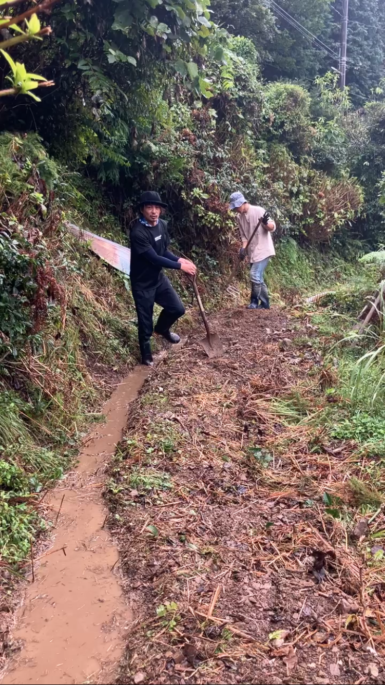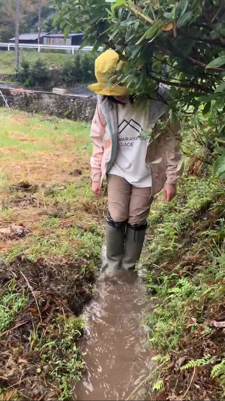 水路を踏んで土を固めて水が逃げないようにしております。水源から田んぼが遠く、途中で水の流れが止まってしまうのでスコップで掘ったり、草を退けたりもしました。