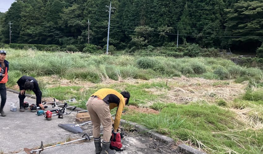 俵山ビレッジは、マギーを中心に田んぼを始めました!元々地域の方がやられていた田んぼ。今では使っておらず、雑草が背丈よりも伸びていました。まずは草刈から。みんなで朝から集まり、男性陣は草刈機を持ち、草を刈り、女性陣は刈ってくれた草を集める作業を。みんなで分担・協力して作業をしました。