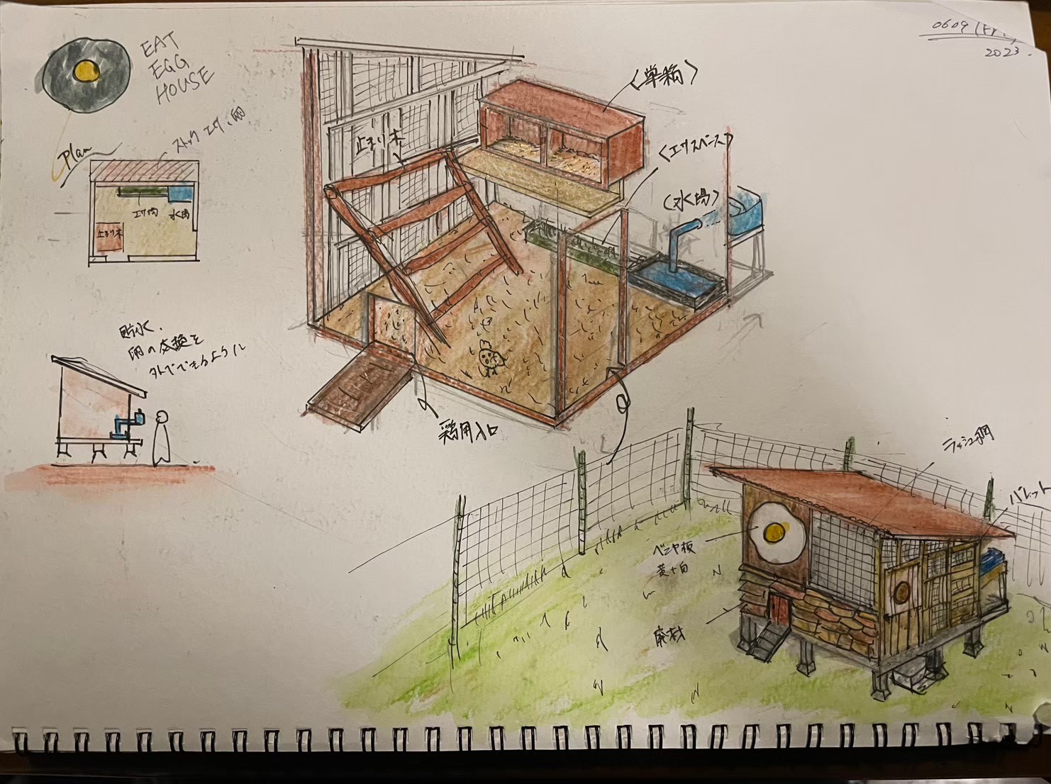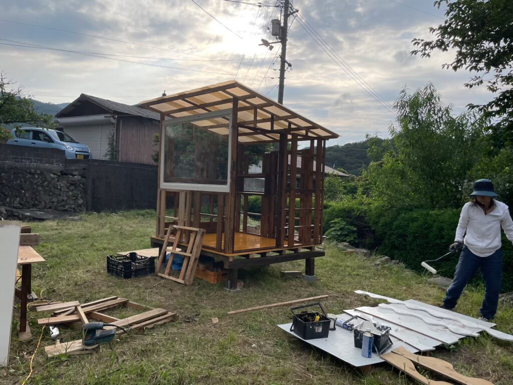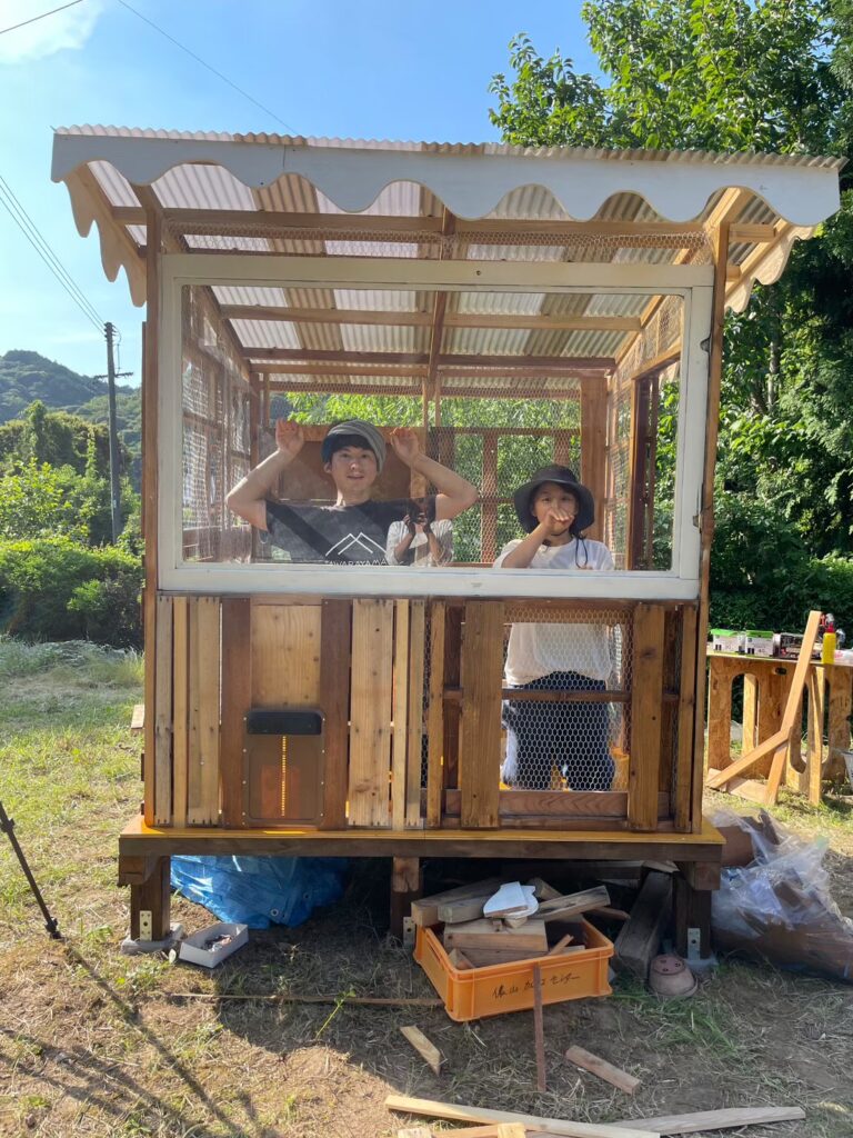 和馬に鶏小屋のデザインをしてもらい、ボランティアスタッフさんの力をお借りしながら小屋制作スタートです。