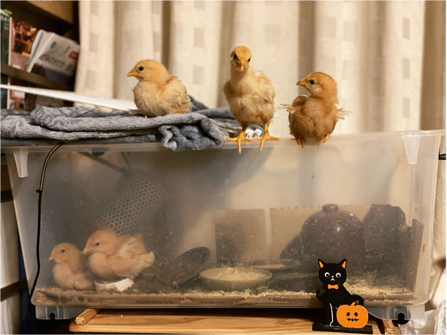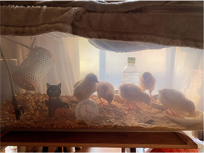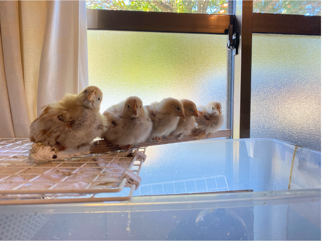 6月に鶏小屋は完成したものの、大切な命をどこから、どんな形でいただくかを検討した結果、10月4日に6羽のヒヨコを灯炬庵にて迎え入れました。