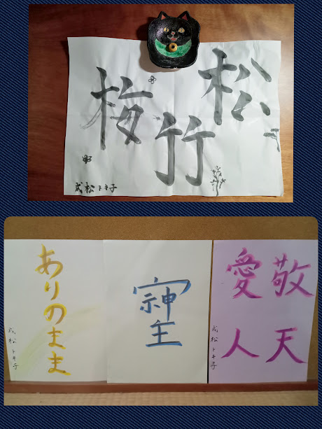 1月1日、みんなで書初めをしました。それぞれ、黙々と集中して思い思いの字を書いていました。ちなみに私が書いた習字は「松竹梅」。